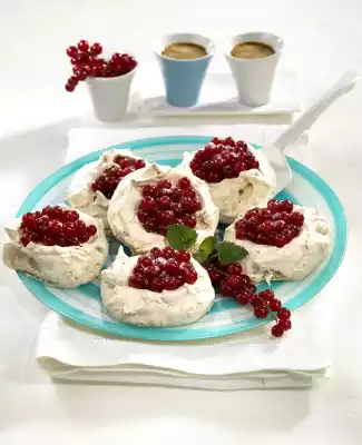 Wash and drain the currants. Then strip them from the panicles. Mix the redcurrants and 3 tbsp. sugar and leave to stand for 5-10 minutes. Shortly before serving, spread into the hollows of the meringue tartlets