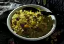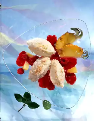 Puree raspberries for the sauce. Stir in vanillin sugar. Cut pineapple into small cubes and add to raspberry puree. Shape the rice into cams with two tablespoons and arrange on plates with the sauce. Sprinkle with coconut flakes