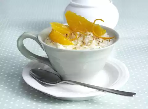 Fold yoghurt under the rice pudding. Serve the rice with orange filets. Decorate with orange peel and coconut flakes.