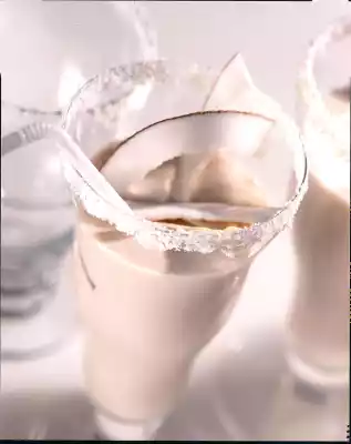 Pour coconut milk into the glasses and decorate with coconut chips.