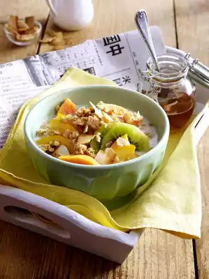 Just before serving, mix the fruit and muesli and arrange in bowls. Add milk and coconut milk. Honey tastes good with it.