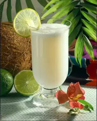 Put rum, Batida de Coco and pineapple juice in a mixer and stir briefly. Pour into a glass and fill up with sparkling wine. Garnish with a slice of lime