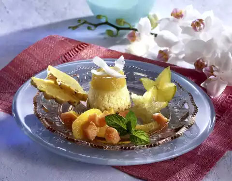 Remove from the edge with a knife, turn over onto plates and decorate with coconut chips and mint. Serve with exotic fruits.