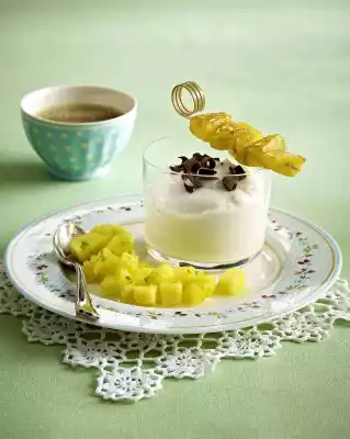 Peel the pineapple, cut into slices and remove the stalk. Wash the lemon balm and cut the leaves finely. Cut half the pineapple into pieces and put them on 4-6 wooden skewers. Finely dice the rest of the pineapple.