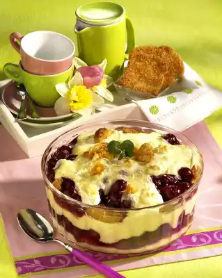 Loosely fold in the egg white. Grease an ovenproof dish (approx. 1 litre capacity). Spread about 1/3 of the pudding mass, 5 rusks and half of the cherries in it one after the other. Place 1/3 of the custard, 5 rusks and the remaining cherries on top.