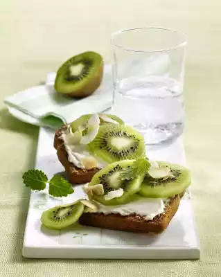 Spread 2 rusks with cream cheese. Peel the kiwi and cut into thin slices. Put 2 slices on each rusk. Sprinkle with coconut chips and garnish with balm. Add the remaining kiwi slices.