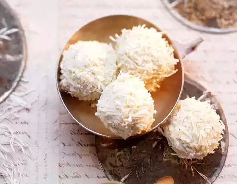 Drain well and turn immediately in the coconut shavings. Put them on baking paper and let them set in the fridge in about 1 hour.
