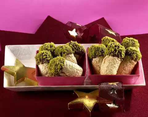 Coarsely chop the chocolate coating and melt in a hot water bath. Dip one end of the stick in chocolate coating, then in pistachios. Drying
