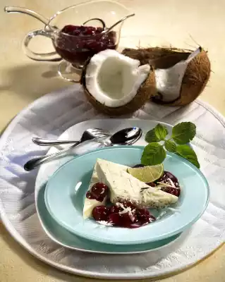 Boil up the rest of the juice and vanilla sugar. Stir in the starch and let it simmer for about 1 minute while stirring. Fold in the cherries. Turn over ice. Cut off approx. 8 slices of ice (refreeze the rest of the ice). Serve the ice cream with hot or cold cherry compote. Sprinkle the rest of the grated coconut on top. Decorate with slices of lime and mint.