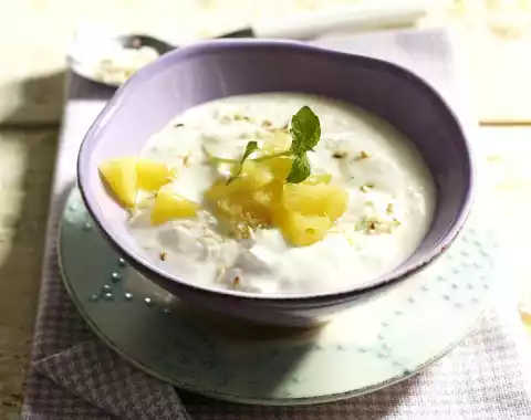 Roast the grated coconut in a pan without fat, take it out and let it cool down. Drain the pineapple. Put some pineapple and grated coconut aside for decoration. Mix the rest with yoghurt.