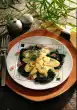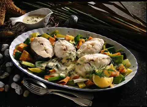 Briefly toss the vegetables in the remaining hot fat. Arrange on a plate with the fish and some sauce. Serve garnished with lemon wedges and dill flags. Remaining sauce extra is enough.