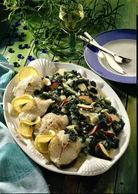 In the meantime peel, quarter and core the apple and cut it into thin slices. Add to the spinach. Mix crème fraîche and cornstarch, add to the spinach and cook for another 1-2 minutes. Add salt, horseradish and season to taste. Arrange fish chops with spinach on a plate and garnish with lemon wheels. Boiled potatoes taste good with it