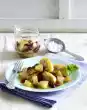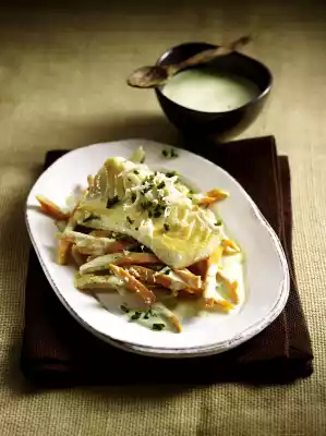 In a second pan, heat 1 tablespoon of oil and fry the fish in it for about 3 minutes on each side. Mix the potatoes with 4 tablespoons of horseradish sauce. Arrange with the fish on plates. Garnish with horseradish and chives.