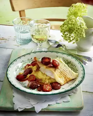 Wash the fish, dab dry, season with salt and pepper and turn lightly in flour. Heat oil in a pan and fry fish for 2-3 minutes on each side. Divide the mashed potatoes on plates, arrange the fish on top and pour on the onion, chorizo and tomatoes