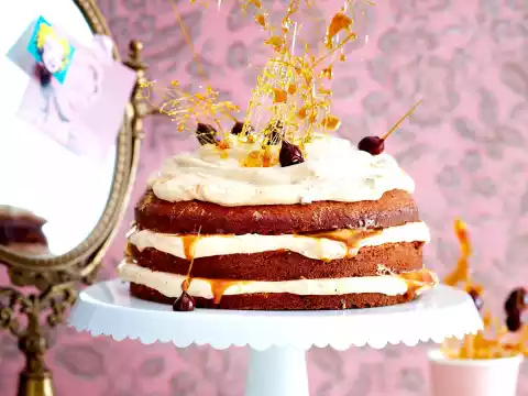 Cover with the cake lid and press down lightly. Add the rest of the cream. Chill for about 1 hour. Decorate with caramel lattice and beans or gold powder as desired shortly before serving.