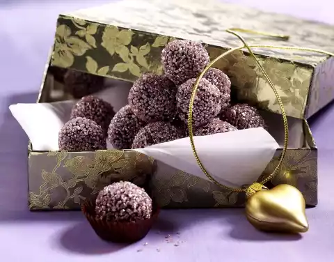 Leave to rest briefly (the mixture becomes firmer as it rests). With cool hands, roll into approx. 30 small balls, placing a chocolate mocca bean in the middle of each ball. If the mixture is too soft, refrigerate again. Roll the chocolates in sugar crumbles, place on baking paper and chill for about 2 hours. Store in a cool and dry place