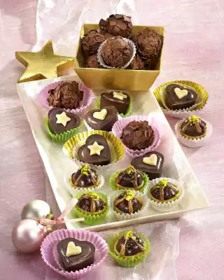 Put the canache into a piping bag with a large perforated spout and squirt a thick, round tuff into each of the praline shells. Leave to cool for at least 1 hour. Bring 1/4 litre of water in a small saucepan briefly to the boil and remove from the hotplate. Pour in 1/4 litre of cold water and put the decor writing tube in for about 5 minutes. In the meantime chop the pistachios finely. Dry the tube and decorate the pralines with a chocolate cross. Sprinkle the pistachios in the middle. Chill for about 1 hour. If necessary, place in chocolate cuffs.