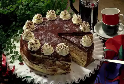 Put them on top of each other and cover with the 3rd cake base. Spread the cake with cream. Dust thickly with a tablespoon of cocoa and the remaining icing sugar. Whip the cream until stiff. Pour into a piping bag with a star-shaped spout and squirt cream dab onto the cake. Dust with the remaining cocoa. Results in about 16 pieces