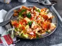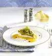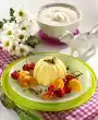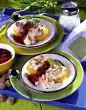 Spread the mixture over 4 cups rinsed with cold water (each containing 150 ml) and chill for at least 2 hours. Add berries, up to 8 pieces for decoration, puree finely and pass through a sieve. Stir in 70 g sugar. Pour some raspberry puree on each of 4 cold plates as a mirror. Dip cups with the coffee cream just to the brim in hot water (about 4 seconds) and carefully turn them over onto the raspberry mirrors. Sprinkle cream with espresso powder and decorate with remaining raspberries. Add the rest of the raspberry puree