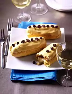 Dip filled eclairs with the top side into the coffee icing and let them set on a cake rack. Decorate with coffee beans if desired.