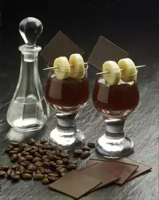 Add 1 tablespoon of banana liqueur to each glass. Make a coffee from coffee powder and 1/4 litre of boiling water. Divide the coffee between the four glasses. Put two banana slices on a wooden skewer.