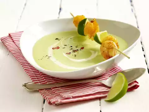 Wash the prawns and dab them dry. Heat the oil in a frying pan. Fry the prawns for about 4 minutes while turning them and season with salt and pepper. Put the prawns and lime wedges on 4 skewers. Arrange the soup and add 75 ml buttermilk to the soup. Garnish with chilli and pepper and serve with the skewers