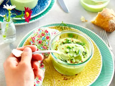 Cut the avocado in half, remove the seeds and peel the flesh. Finely puree the cold cucumber mix, avocado and yoghurt. Season with salt and pepper.