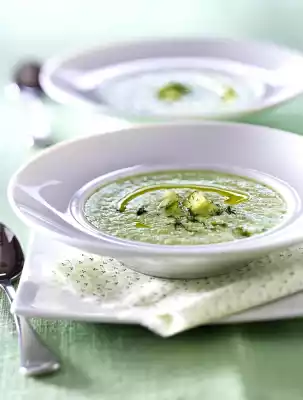 3 Wash the reserved half cucumber, dice it into small cubes. Add them to the soup, drizzle with oil and stir well. Serve immediately.