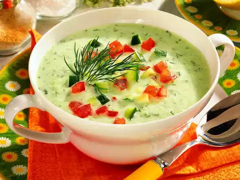 Wash the dill, chop finely and stir into the soup, except for something to garnish. Clean, wash and chop the tomato. Sprinkle tomato and cucumber cubes over the soup. Garnish with dill.