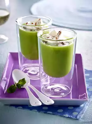 Wash mint, shake dry and pluck off leaves. Finely puree peas, mint and approx. 250 ml broth. Add the remaining stock. Pass the soup through a sieve. Chill the pea soup for about 1 hour