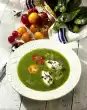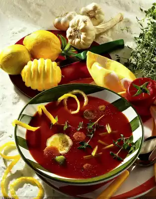 Season with salt and pepper. Deglaze with 200 ml water. Cover and cook for about 15 minutes. Put half of the vegetables aside. Puree remaining vegetables in stock and tinned tomatoes. Season soup again with salt, pepper and lemon juice, let it cool down completely.