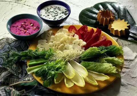 Divide the chicory into individual leaves. Arrange the prepared vegetables on a plate. Peel the cooked beetroot, dice finely and mix with the egg and kefir. Season to taste with salt and pepper. For the sour milk dip, peel the garlic and crush it in a garlic press.