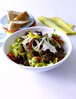 Season to taste coleslaw. Serve with minced meat, onion rings and 1 blob of yoghurt. Serve the rest of the yoghurt separately. Serve with pickled peppers and flatbread. Drink tip: dry red wine.