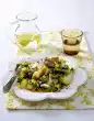 Clean and wash the cucumber, cut it in half lengthwise and cut it into thin slices. Clean, wash and cut the bell peppers into thin strips. Wash parsley, cut into strips. Mix everything with olives into the cabbage.