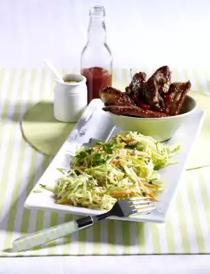 Wash and clean the parsley and chop it except for something to garnish. Season coleslaw again. Sprinkle with parsley. Serve the coleslaw with the spare ribs. Garnish with parsley and 1 chilli pepper.