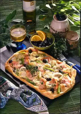 Drain the artichoke hearts. Clean and wash spring onions and cut them into pieces of about 3 cm. Take the pizza dough out of the package, unroll it at the cutting point and cut it into 2 pieces of equal length. Place the pieces slightly overlapping on a baking tray lined with baking paper. Tap the edges inwards slightly so that there is a small rim all around. Halve the turkey breast slices and artichoke hearts and spread on the pizza dough with the olives and spring onion pieces.