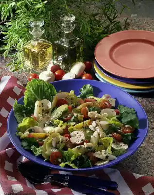 Clean and wash the lettuce and rocket and pluck into bite-sized pieces. Wash and halve or quarter the tomatoes. Clean mushrooms, wash if necessary and cut into thin slices. Fold everything into the asparagus, season again
