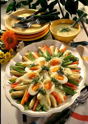 Cook the asparagus in plenty of boiling salted water with a pinch of sugar for about 15 minutes. Add the carrots and mangetouts to the asparagus about 5 minutes before the end of the cooking time. Hard boil the eggs in boiling water for about 10 minutes.