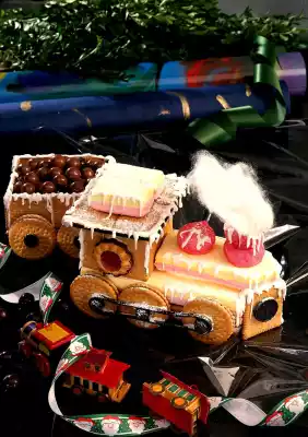 For the wheels 2x3 De Beukelaer biscuits side by side. Stick a fruit jelly sweet in the middle of each one. Wrap a liquorice snail and stick it around the sweets. Leave to dry. Then glue the wheels to the locomotive