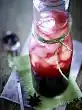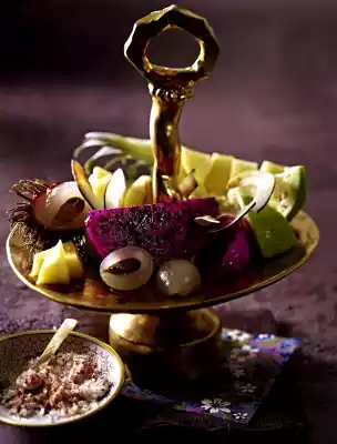 Take the syrup off the stove and let it cool down. Wash and clean the chillies, cut them in half and remove the seeds. Chop the chilli and salt finely or crush in a mortar. Arrange fruit and coconut chips on a plate or shelf. Drizzle syrup over them and serve with the chilli salt