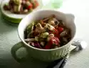 Stir in herb mixture. Drain eggs, quench, peel and cut into eighths. Mix noodles, peas, tomatoes and sauce. Flavour again. Carefully fold in the eggs. Arrange salad in a bowl, garnish with parsley