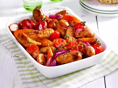 Take out and put into an ovenproof dish (approx. 20 x 25 cm) with the vegetables. Bake in the preheated oven (electric cooker: 200 °C/ convection oven: 175 °C/ gas: see manufacturer) for 25-30 minutes. Cover with foil after 20 minutes if necessary.