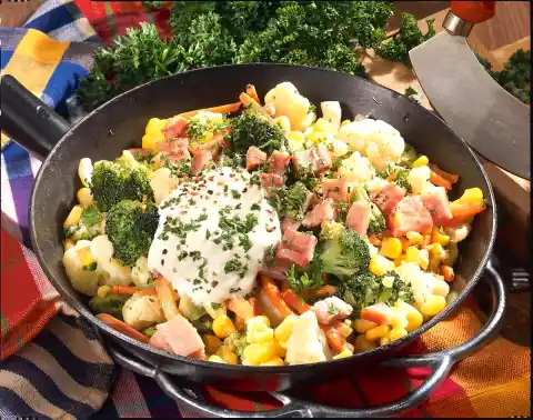 Drain the corn, dice the ham. Add both to the vegetables and heat. Season with salt, pepper and nutmeg