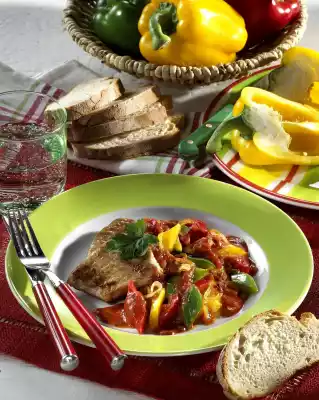 Arrange cutlets and paprika vegetables on plates and garnish with parsley. Ciabatta tastes good with it.