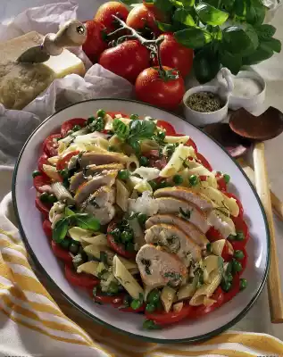 Leave to stand for about 15 minutes. Arrange on the tomato slices. Cut the chicken filet into slices and spread on the salad. Sprinkle with parmesan and serve garnished with basil.