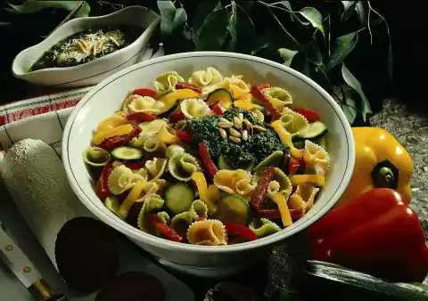 Defrost the spinach for the spinach sauce. Cook the pasta in salted water with oil for about 8 minutes. Drain and let it cool down. Clean and wash the vegetables. Cut peppers into fine strips and zucchini into very thin slices. Cut salami into sticks.