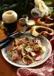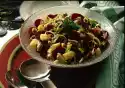 Mix pasta with the prepared ingredients. Mix lemon juice with 1 pinch of salt, pepper and sugar. Marinate the noodles with it. Cover and let it soak through a little. For the sauce peel onion and garlic. Chop onion finely, chop garlic very finely. Grate cheese, roast pine nuts until golden brown. Heat 1 tablespoon of oil. Sauté onions and garlic lightly. Deglaze with broth. Add remaining oil, half of the cheese and pine nuts to the spinach.