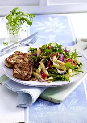 Peel onion and cut into fine slices. Boil up 100 ml broth, vinegar, some salt and pepper. Pour the hot marinade over pasta, beans, onion and bell peppers. Add olive oil and mix everything well. Leave to soak for at least 1 hour. Clean, wash and drain the rocket. Cut turkey fillets into 4-5 medallions each. Roast the pine nuts in a pan without fat, take them out immediately and let them cool down. Heat up a grill pan brushed with oil. Fry the turkey medallions for approx. 4 minutes while turning. Season with salt and pepper, remove and wrap in aluminium foil.