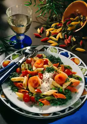 Pour the sauce over the ingredients, mix gently and leave to stand for approx. 30 minutes. Form salmon into small florets and place on the salad. Serve the salad sprinkled with coarse pepper.