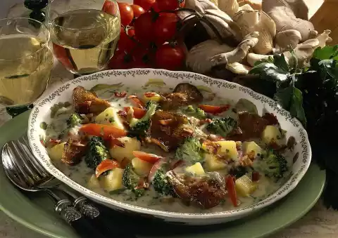 Season to taste with salt, pepper and nutmeg. Add the potatoes, broccoli, mushrooms, tomatoes and 2/3 of the bacon cubes to the sauce and warm it up. Season the ragout if necessary. Arrange in a bowl. Serve sprinkled with the remaining bacon.